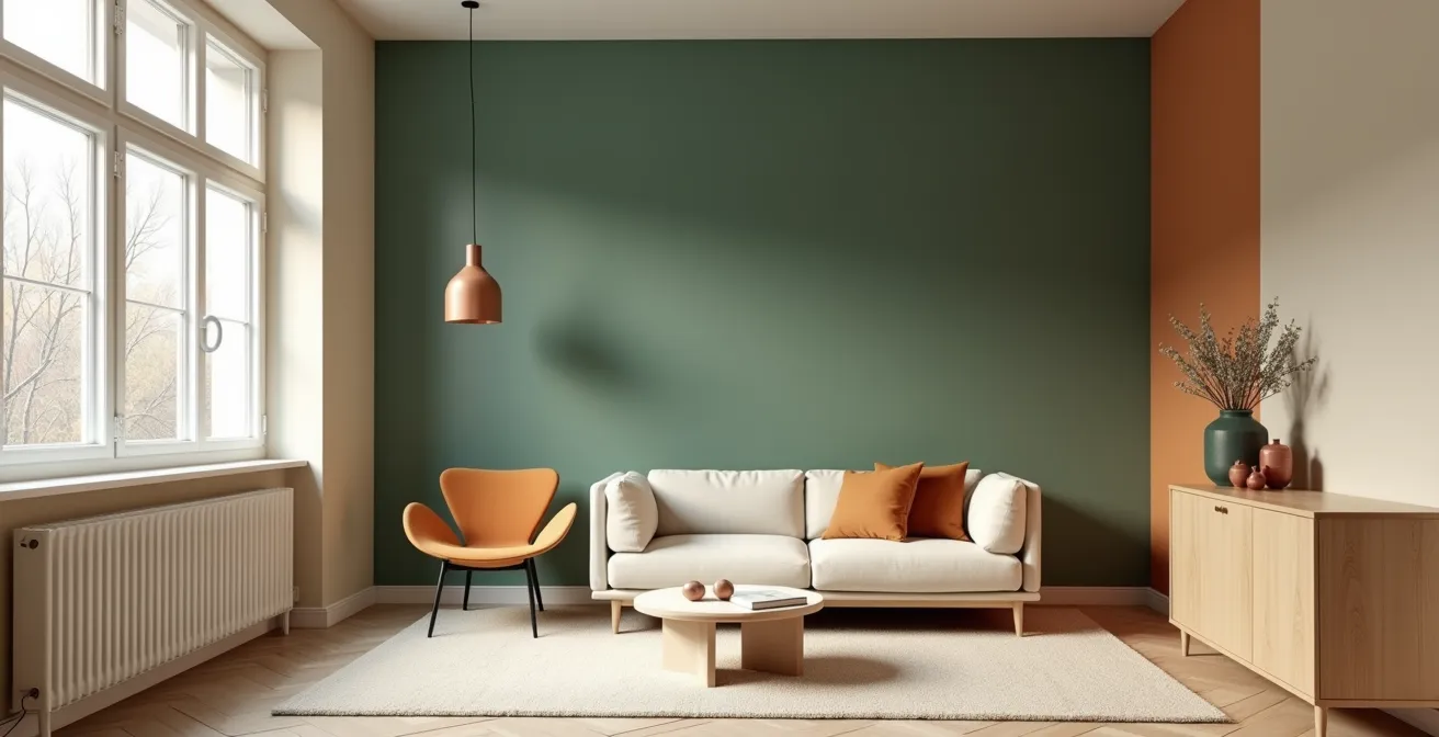 Für ein deutsches Nordzimmer, egal ob in einem Altbau mit hohen Decken oder einem Neubau, bedeutet dies eine klare strategische Aufteilung. Die 60 % Hauptfarbe ist typischerweise die Wandfarbe. Hier eignen sich warme, gebrochene Weißtöne oder helle Greige-Nuancen (eine Mischung aus Grau und Beige), die das kühle Licht neutralisieren. Die 30 % Sekundärfarbe findet sich auf größeren Flächen wie dem Sofa, den Vorhängen oder einem Teppich wieder. Ein warmes Mittelgrau oder ein sattes Beige kann hier für Substanz sorgen. Die verbleibenden 10 % sind die Akzentfarbe. Das sind die aufregenden Farbtupfer, die dem Raum Leben einhauchen – Kissen, Kunstwerke oder Deko-Objekte in kräftigem Ockergelb, erdigem Terrakotta oder warmem Rostrot. Sie fungieren als „visuelle Wärmeinseln“, die den Blick anziehen und für Gemütlichkeit sorgen.